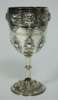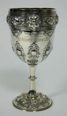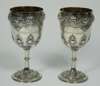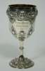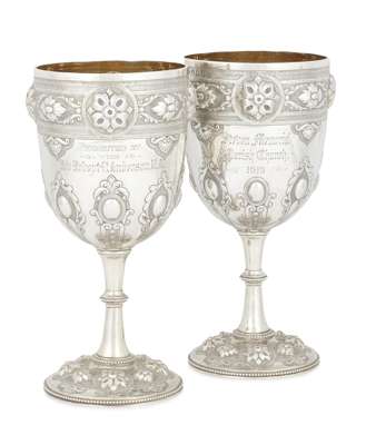 Elkington & Co, Glasgow 1919, the tapered bowls with border of foliate bosses, panels and straps, engraved inscription, all raised on a knopped stem with an embossed foot (2)