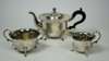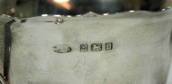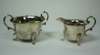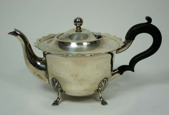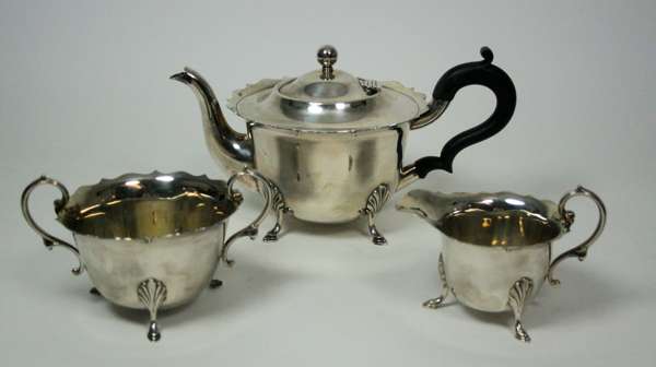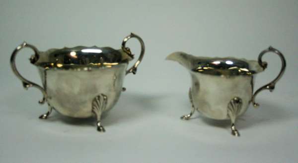 Birmingham 1912, the plain bodies with everted scalloped rim and S scroll handles, raised on foliate hoof feet (3)