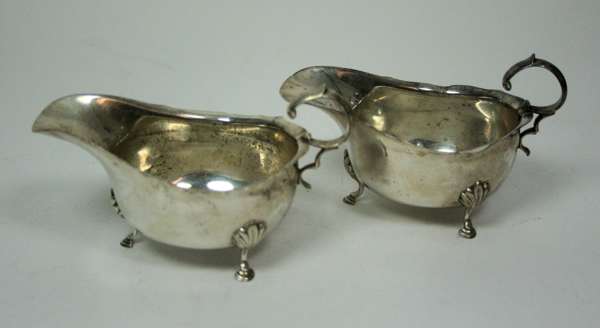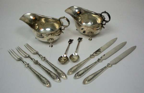 George Edward & Sons, Sheffield 1908, of conventional form with foliate decoration to handles; together with a pair of sauce boats, marks indistinct; and a set of six silver plated teaspoons, the finials set with opals (qty)