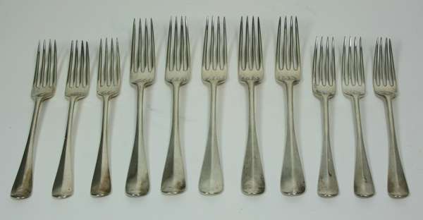 London 1901, of Hanoverian pattern with initial to terminal; together with five matching table forks (11)