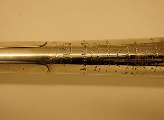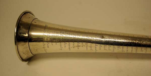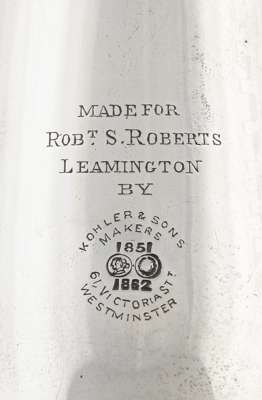 Kholer & Sons, London 1894, of traditional form with simple flared shaft and stem, with applied strengthening bars and flared bell, the bell engraved with crest and list of 'Subscribing Tenants', additionally inscribed 'Made for Rob't S Roberts Lemington'