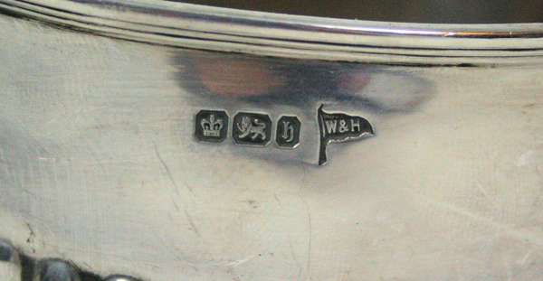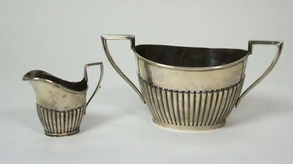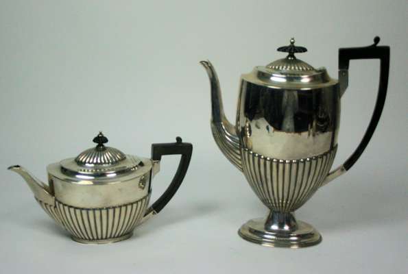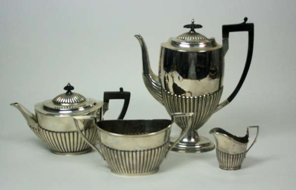 various makers and dates comprising coffee pot, teapot, tin handled sugar (at later matched) milk jug), each with gadrooned lower sections of body and angular handles (4)