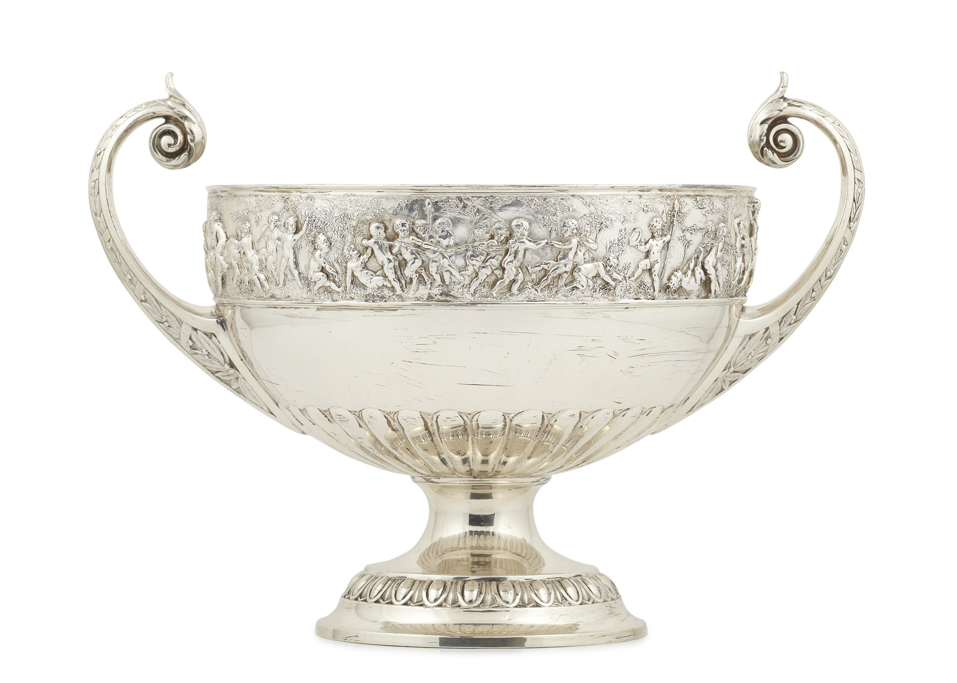F Elkington, Birmingham 1891, of tapered hemispherical form with twin scroll handle, the upper rim with chased running border of cavorting putti in a landscape, raised on a short stem and domed foot, in fitted case