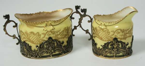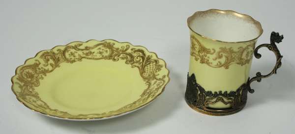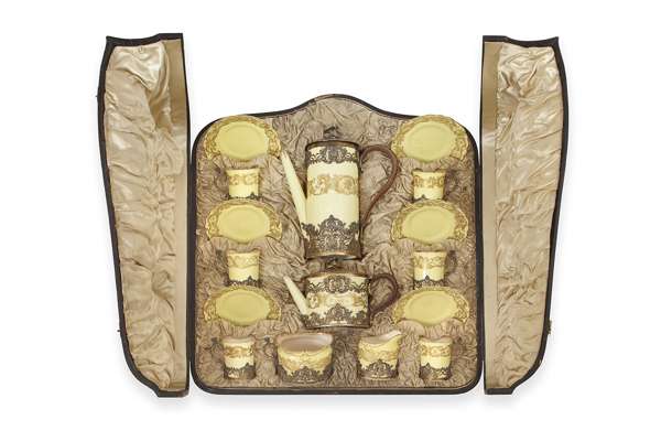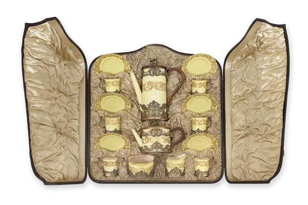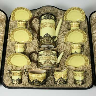 Royal Worcester pattern code 204798, silver mounts marked William Hutton & Sons, London 1895, comprising six saucers and cups, a sugar bowl, milk jug, tea pot and coffee pot, the ground yellow with gilt decoration, the silver mounts of a similar scrolling and foliate design, in original fitted presentation case