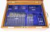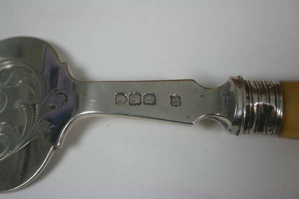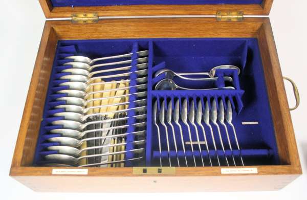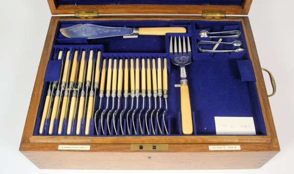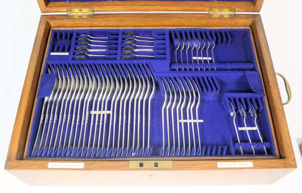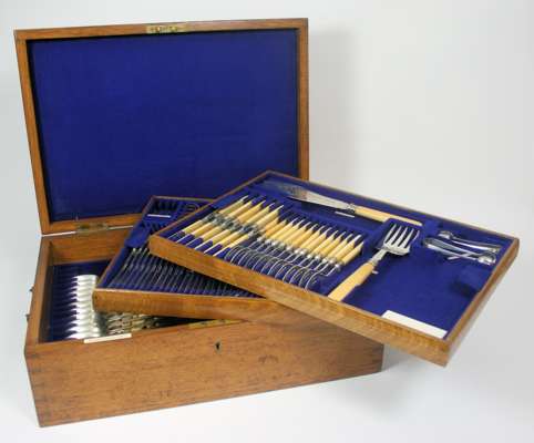 London 1889, of Hanoverian pattern with engraved initials, comprising; sixteen table spoons, eleven dessert spoons, eleven teaspoons, twelve coffee bean terminal spoons, eight dessert forks, twenty four table forks, two sauce ladles, two pairs of sugar tongs, fish serving knife and fork, twelve fish knives, twelve fish forks (all with ivory handles); together with a matched group of steel bladed knives, containing in a two lift out drawer oak canteen