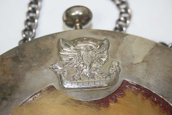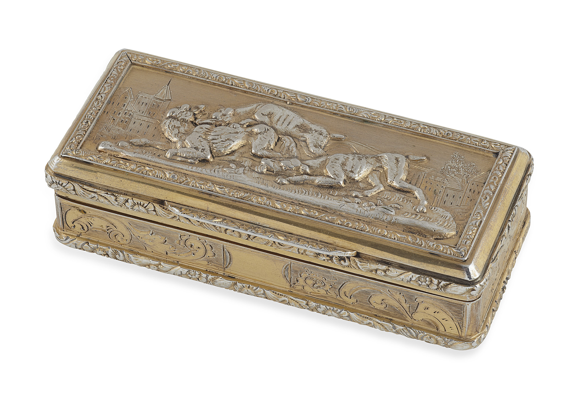 with indistinct control mark, the lid with hounds in relief and engraved town scene in background, floral decoration to sides and engine turned detail to the base