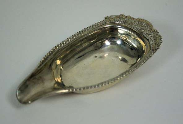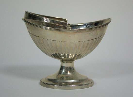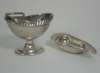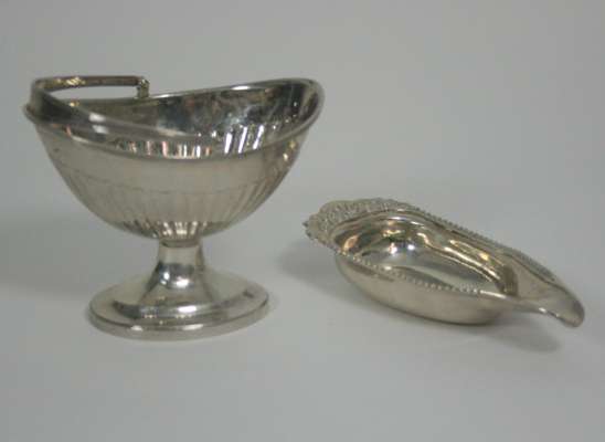 TW, Newcastle, circa 1780, of oval outline the tapered bowl with fluted lower section, plain swing handle on a simple foot and spreading base; together with a George III pap boat, London 1813, gadrooned rim fruiting vine and shell handle (2)