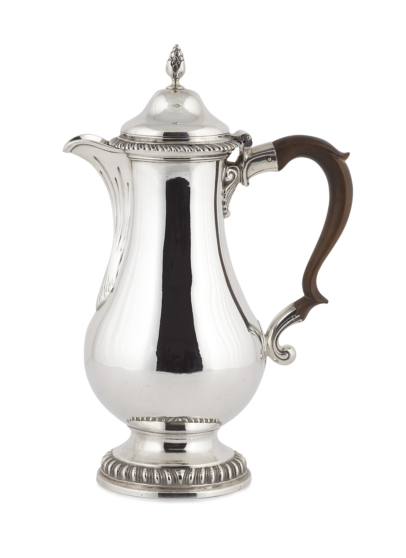 Thomas Evans (possibly) London 1774, the plain baluster body with short fluted spot and S scroll wooden handle, with domed cover with bud finials and gadrooned rim, raised on a short stem and gadrooned foot