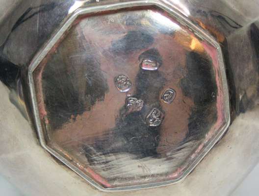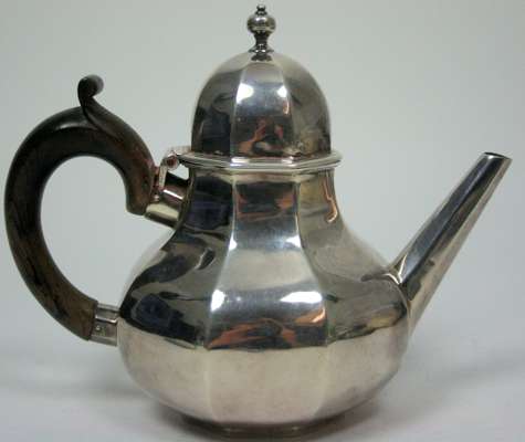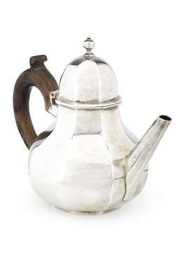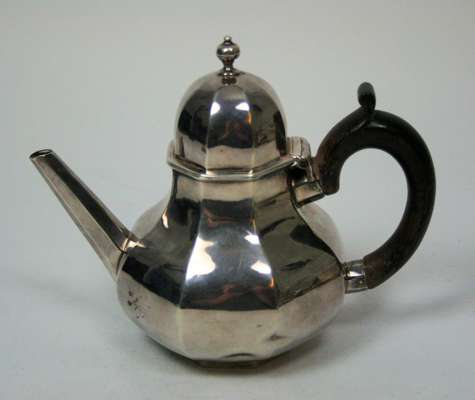 John Carnaby, Newcastle 1721, of octagonal form with domed hinged cover and facetted straight spout, with simple C scroll wooden handle and raised on a simple collar foot
