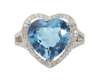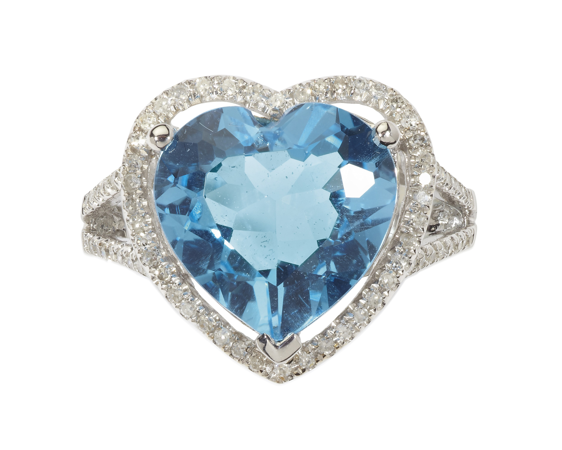 claw set with a heart shaped topaz in a single border of round cut diamonds, the split shoulders set with round cut diamonds to a white metal shank stamped 14K
