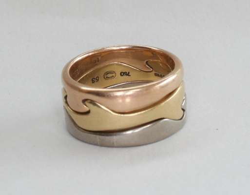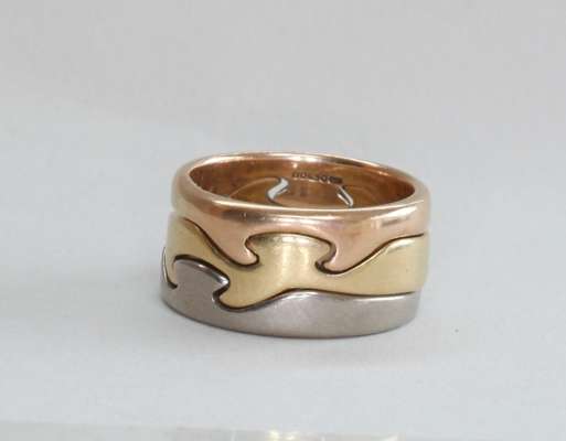 comprising three inter-locking rings of plain abstract design, each modelled in white, yellow and rose gold (3)