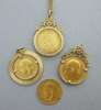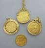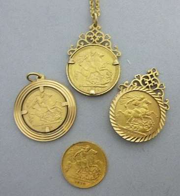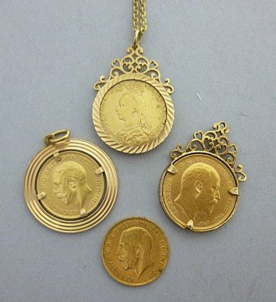an 1889 sovereign in a loose gold mount with pierced scrolling detail, to a belcher link chain, another 1904 example in similar mount; a 1911 half sovereign in loose mount with reeded detail; a 1912 half sovereign (4)