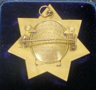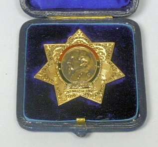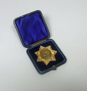 apparently unmarked, the badge of seven pointed star form, the centre oval with oval profile of an American officer, within an enamelled border with four gold stars, and clasped hands motif below. Engraved ground with Stars and Stripes and enamelled battle honours, the rear removable gold panel engraved "Killed in American War 24th May 1864 Lieutenant Nelson Fletcher aged 32", in fitted box