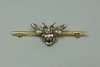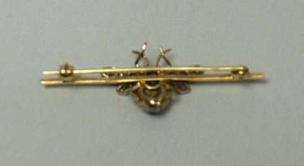 the gold knife edge bar with applied bee, the body, wings and head set diamonds, sapphires to the bottom