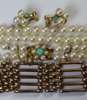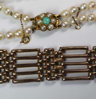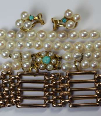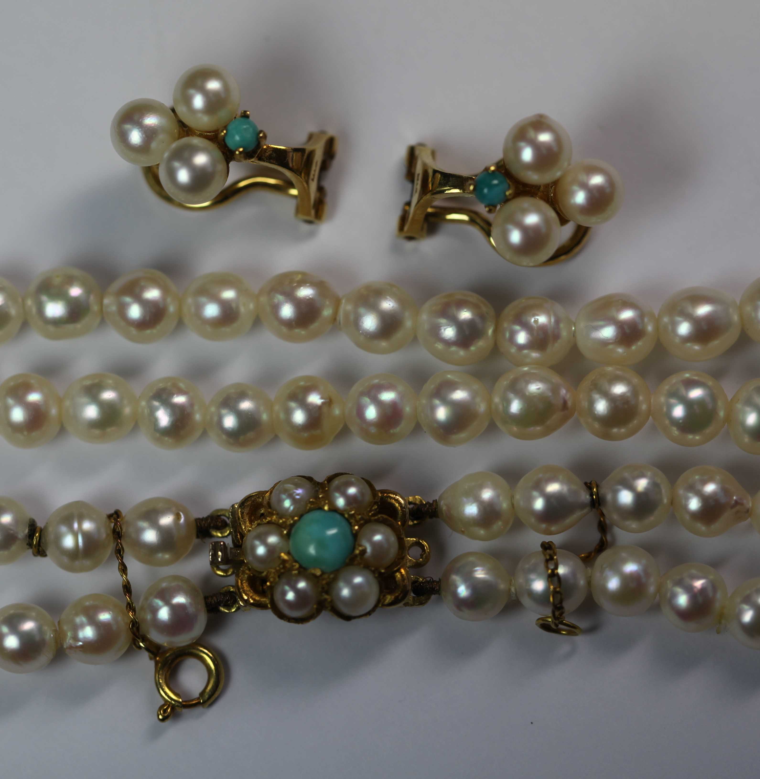 of gate form, with padlock clasp, together with a pearl necklace and matching ear clips, the cultured pearl necklace of double strand form, pearl and turquoise set clasp, with safety chain and pair of ear clips to match the clasp