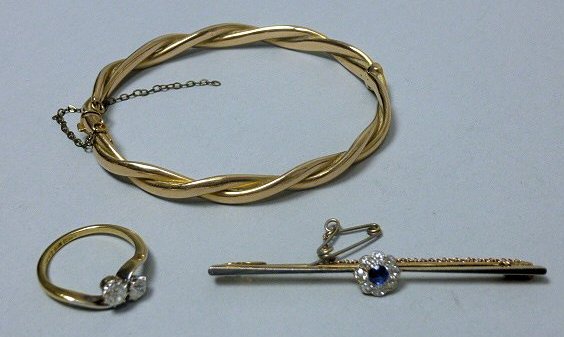 claw set old mine cut stones in platinum, of crossover design, 18ct yellow gold shank, a 1920s bar brooch onset small millegrain cluster of central sapphire and diamond set border, and a hinged 9ct gold twist bangle (3)