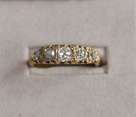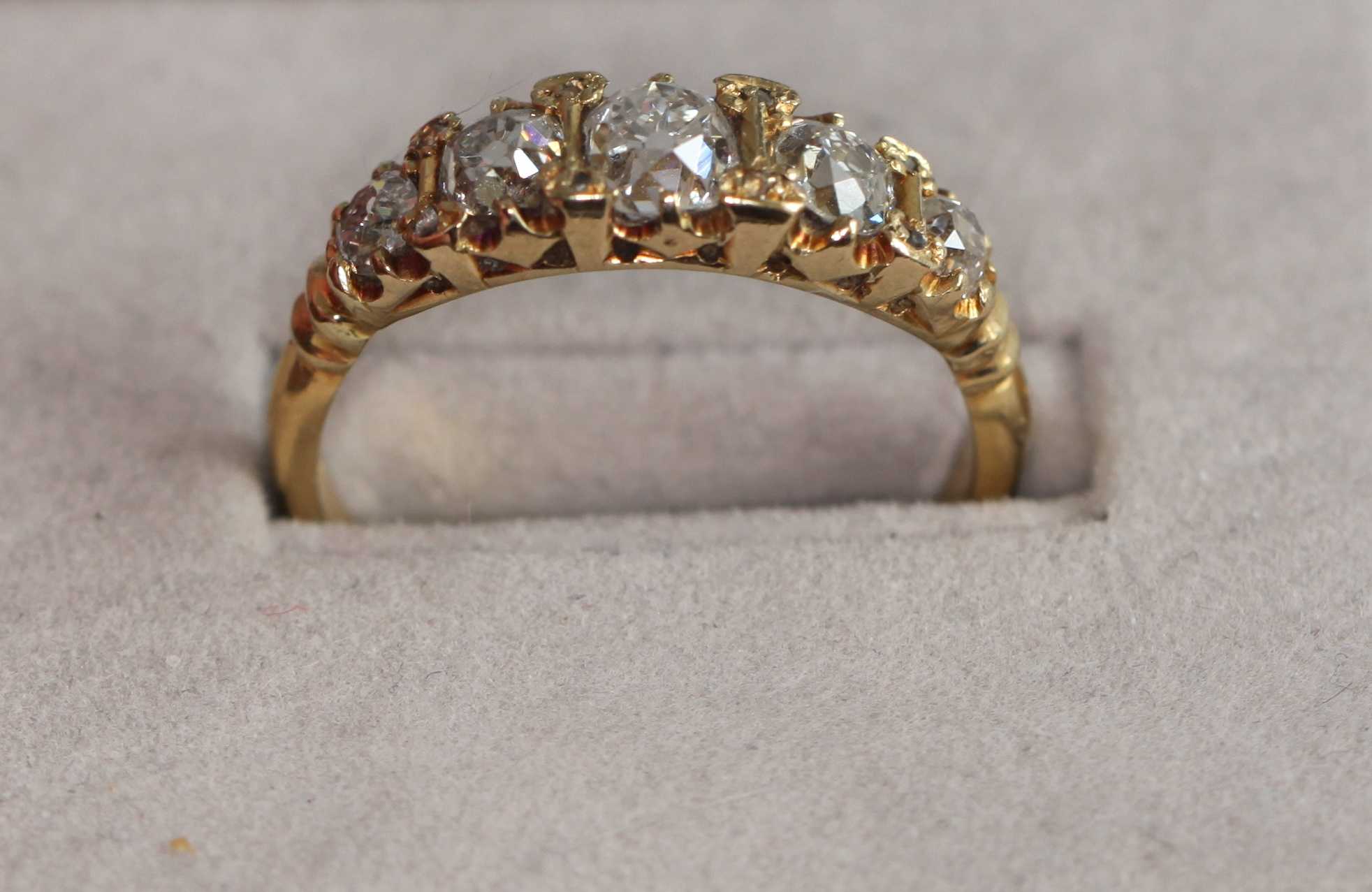 the graduated cushion cut diamonds, claw set, scrolling gallery in yellow metal stamped 18ct