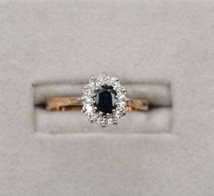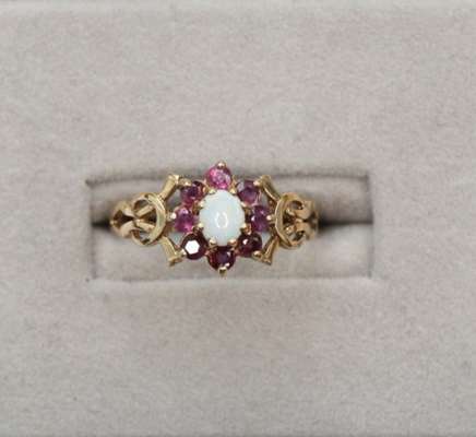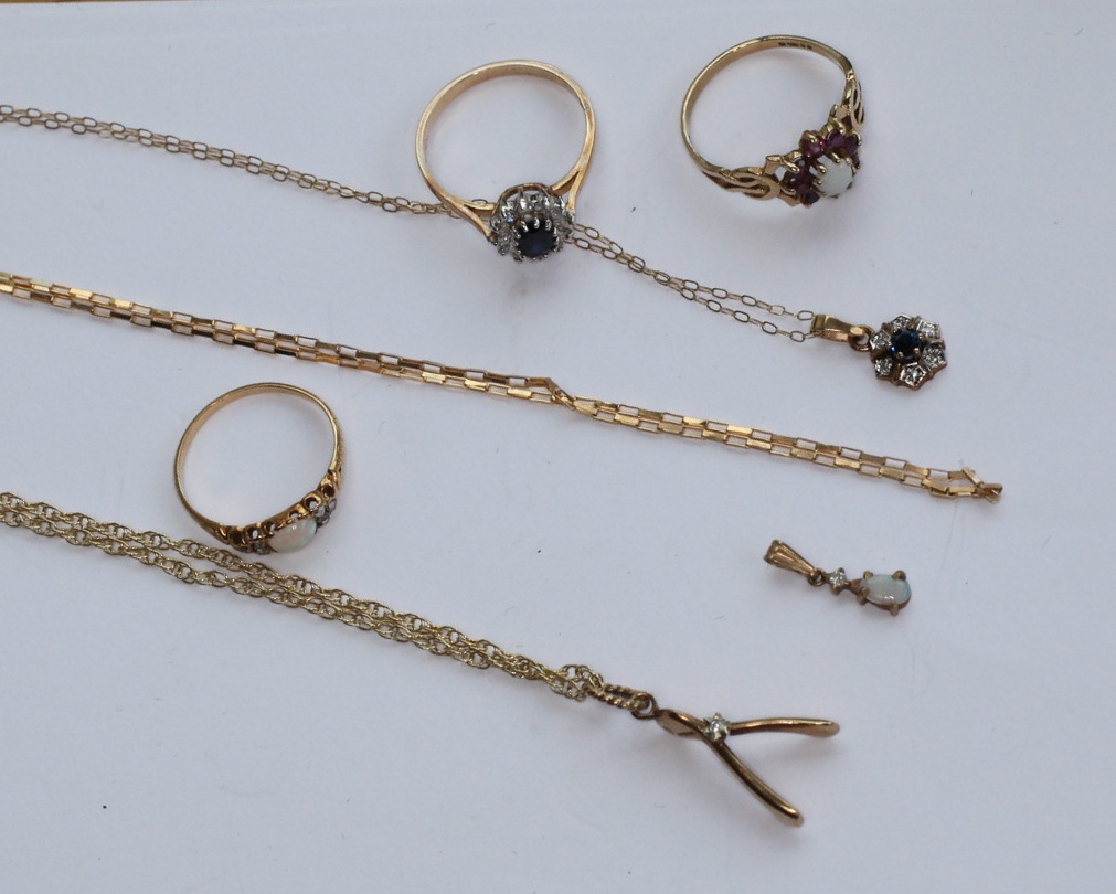 claw set with an oval cut sapphire, single border of round cut diamonds, 9ct gold shank; a sapphire and diamond cluster pendant, yellow metal chain; an opal and ruby set cluster ring, 9ct gold shank; an opal and diamond ring; a 9ct gold wish bone pendant set with a small round cut diamond, 9ct gold chain; an opal and diamond set pendant; various pairs of pearl and gem set earrings; a diamond and sapphire cluster ring, claw set a round cut diamond, in a border of eight small sapphires; a 9ct gold floral pendant, set a small ruby, 9ct gold belcher link chain; a pair of associated ear studs; a sapphire and diamond set ring; a single stone diamond pendant chain; a diamond and sapphire set pendant and chain; two pairs of yellow metal and gem set earrings (qty)