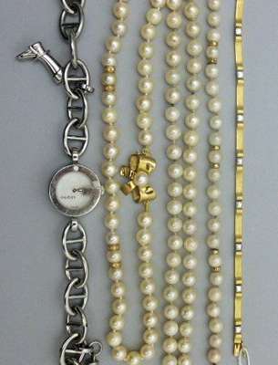 polished stainless steel case and bracelet, diamond set bezel, charms to bracelet, with box and papers, together with an 18ct gold diamond set bracelet, composed of brushed yellow gold bar links, white gold square links set with nine princess cut diamonds; a pearl necklace with ribbon clasp, in 9ct gold set single pearl, of even size, with four gold spacers set small single cut stones; a small pearl bracelet with gold spaces; a long strand of even sized pearls, 15ct gold ball clasp