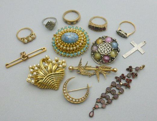 a pearl set ring with three claw set pearls; a navette shaped diamond ring; a gold ring gypsy set with three sapphires; together with a miscellaneous collection of jewellery to include; pearl set crescent brooch; pearl and gem set swallow brooch; a garnet set ring; a 19th century garnet set pendant, other brooches etc (qty)