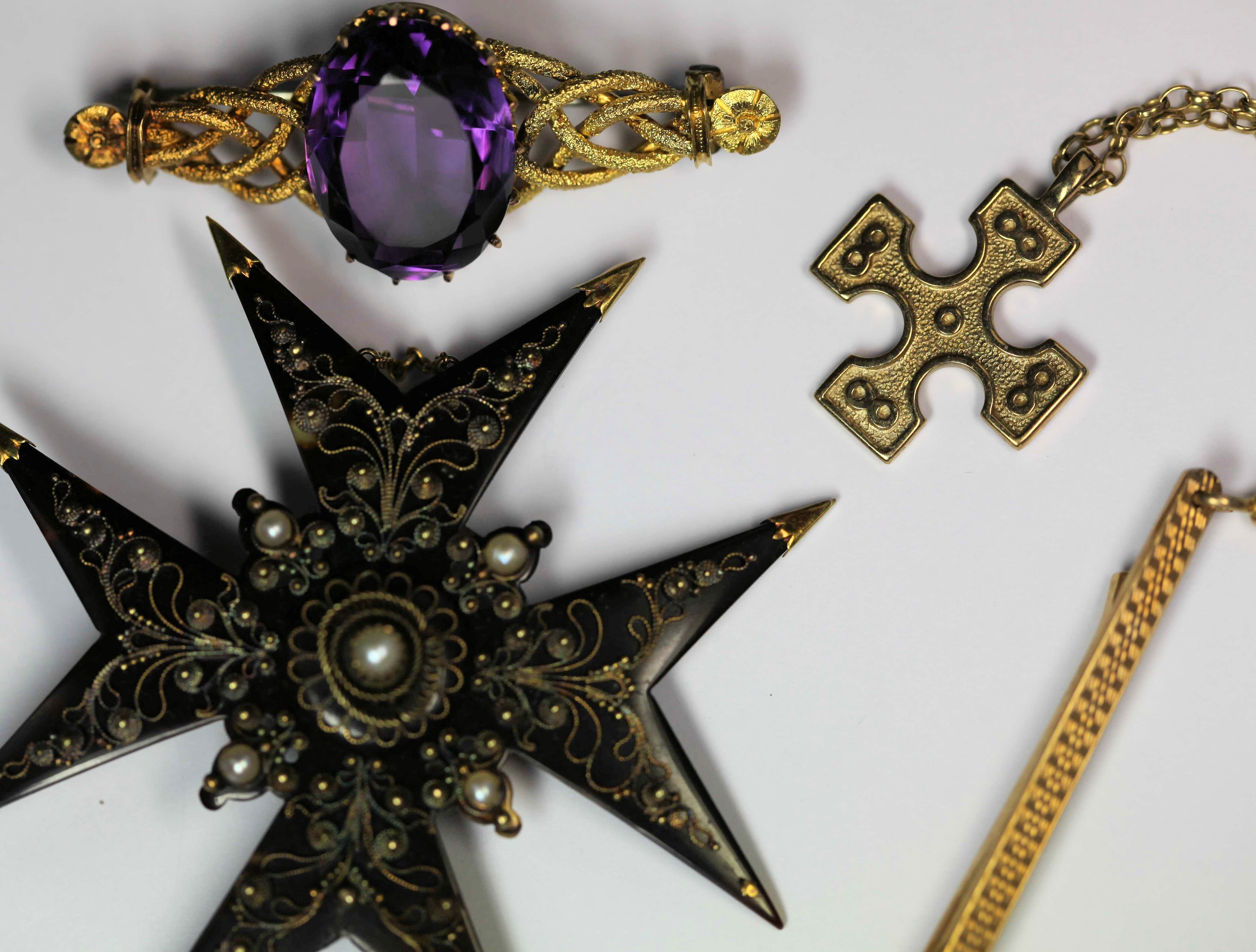 simple engraved decoration, trace link chain; a gold bar brooch, set oval amethyst knotted design to the metalwork; an early 19th century tortoiseshell star brooch set wire work and pearl detail; a 9ct gold tie slide and chain