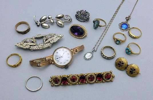 with pearl set surround, various gold wedding bands, a cameo ring, two other rings, a gold wrist watch, brooches, a Victorian cluster ring set turquoises, a small opal set ring, a zircon ring, a diamond and ruby ring (qty)