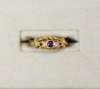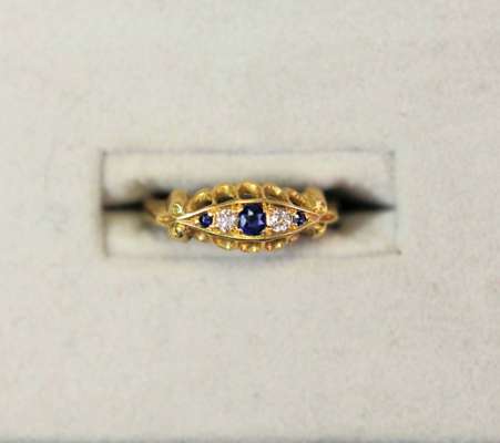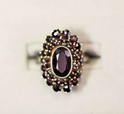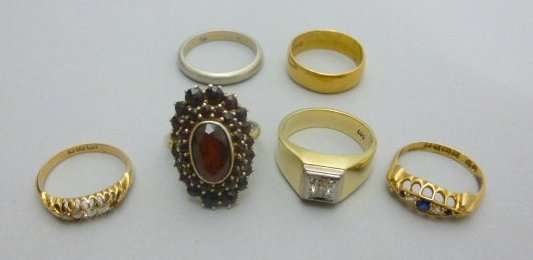 to include a 22ct gold wedding band; a yellow metal signet ring stamped 585, set with a single round cut diamond; an 18ct gold five stone diamond ring (one diamond deficient); a sapphire and diamond set ring; a garnet set cluster ring; a yellow metal band (6)