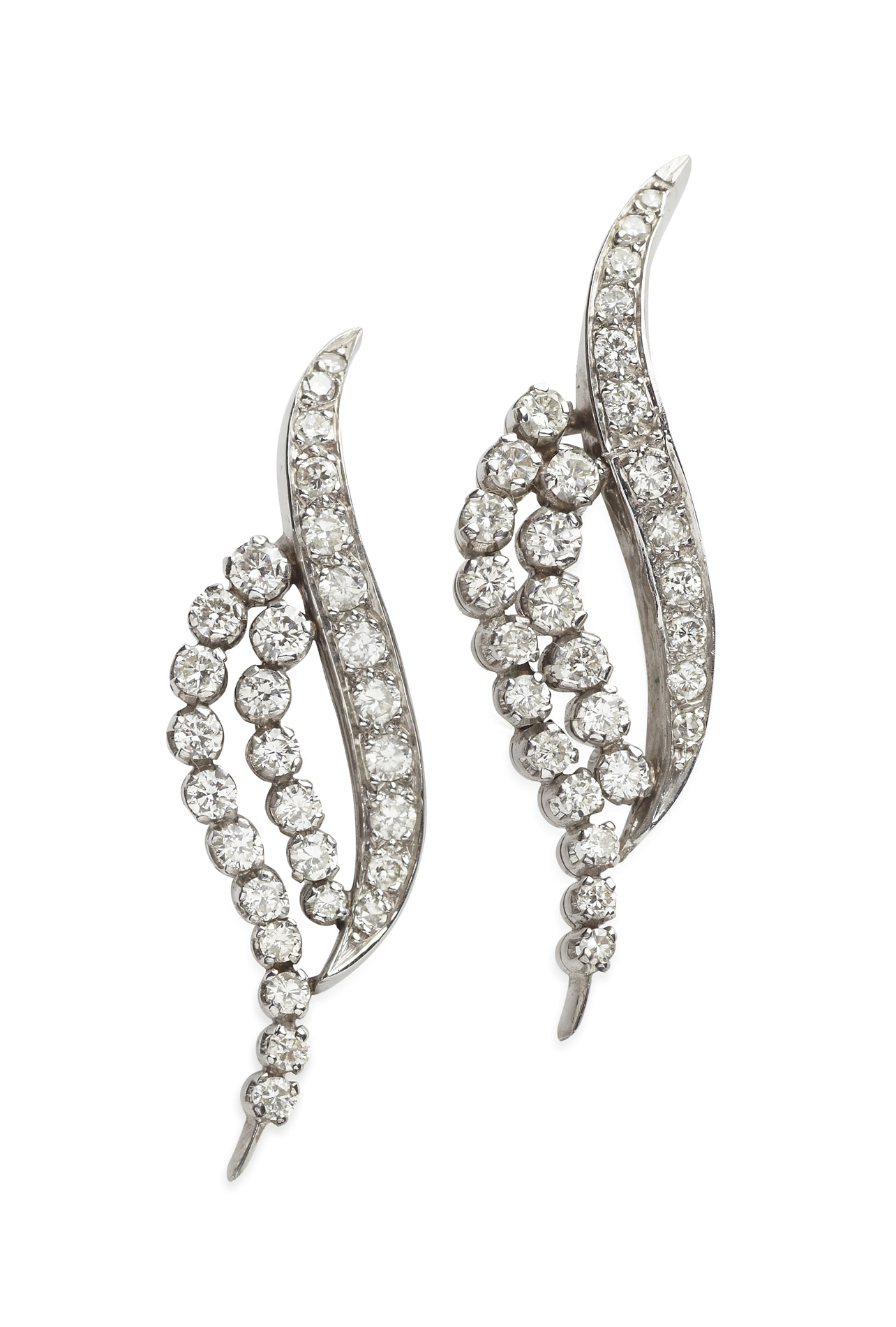 of scrolling design set throughout with graduated round cut diamonds, set in unmarked white metal with post and clip fittings