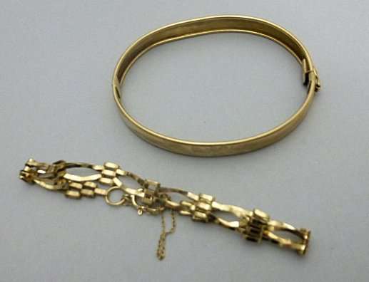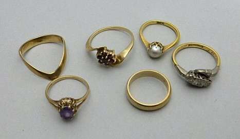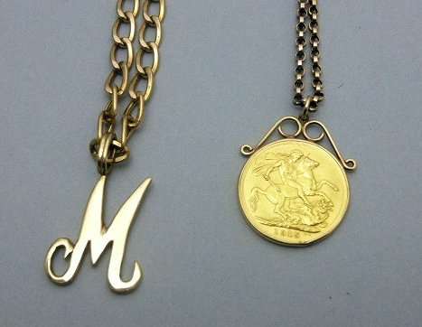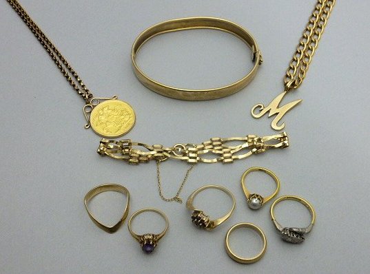 a sovereign pendant, loose mount and belcher link neck chain; a 9ct gold hinged bangle, plain; a 9ct gold neck chain with letter M pendant; a bracelet; six various gem set and other rings (qty)