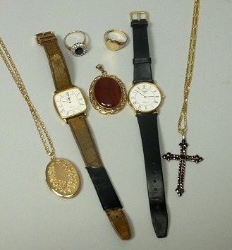 to include; LONGINES - two quartz wrist watches, Presence model, a garnet set cross with a 9ct gold neck chain, an engraved locket with a 9ct gold neck chain, an oval agate pendant within a pierced 9ct gold frame, a sapphire and CZ cluster ring, a 9ct gold signet ring (qty)