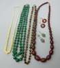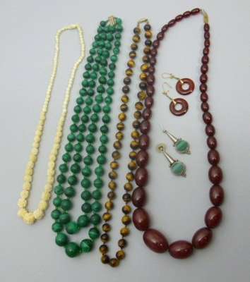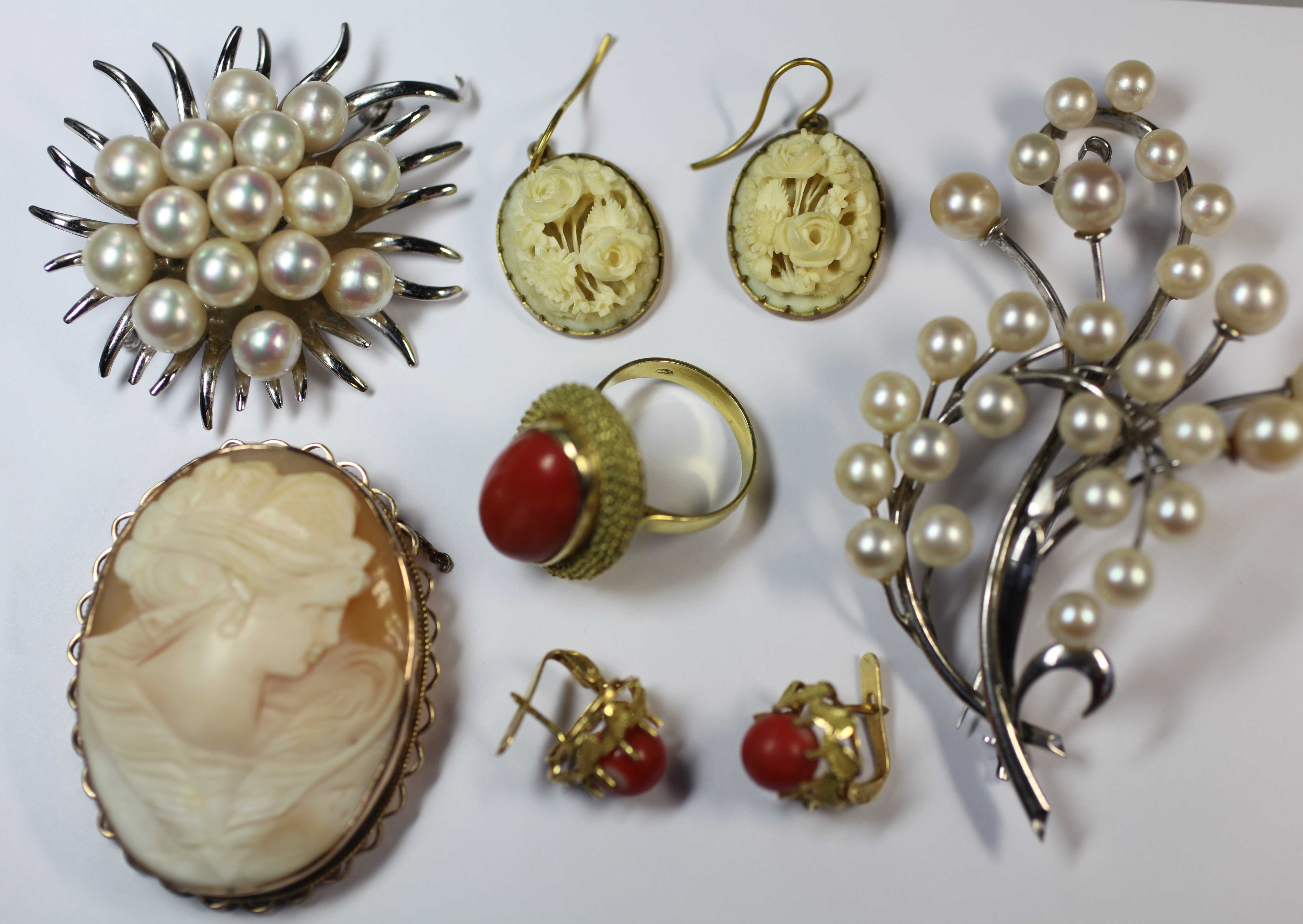 depicting an young lady in profile, in a yellow metal mount; together with a coral and yellow metal dress ring, stamped 750; a pair of coral set ear clips; two cultured pearl set spray brooches; a pair of carved ivory ear pendants; a double strand of malachite beads, each row strung with graduated green malachite beads with clear green bead spacers; together with a single string of graduated amber beads; a single string of uniform tigers eye beads; a carved ivory necklace; various earrings, (qty)