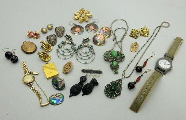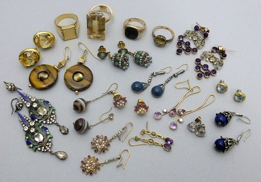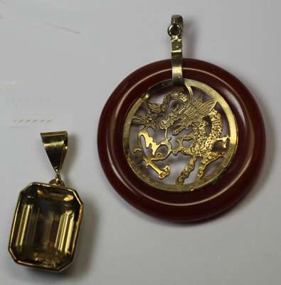 to include four yellow metal and gem set dress rings; two pairs of pink gem and seed pearl set earrings, a pair of yellow metal and citrine set ear clips; various other gem set earrings, two pendants, a cornelian bi-disc with central pieced metal disc with dragon motif; a rectangular cut quartz set pendant; three yellow metal lockets; a wedding band; three early 20th century style gem set pendants, two wrist watches; various chains; several pairs of gem, paste and enamel set earrings; various other cufflinks, necklaces and other items (qty)