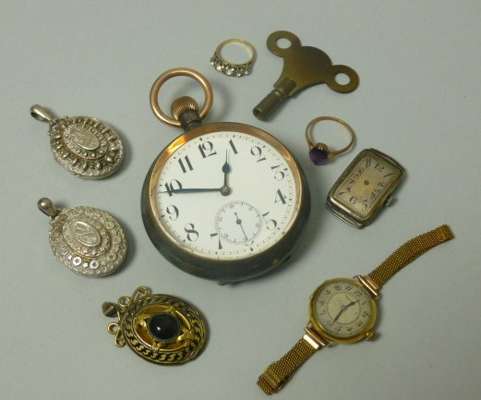 A Victorian gilt, enamelled and banded agate set pendant; a gun metal cased large travel watch; a 1920s gold cased lady's wrist watch; an art deco period silver cased wrist watch; a pair of silver lockets; two paste set gold rings; a cased daguerrotype (qty)