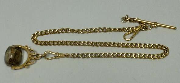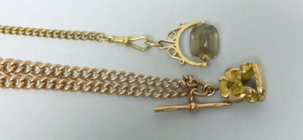 of curb links, with a suspended fob, plain gold intaglio, and another gilt chain with gold fob