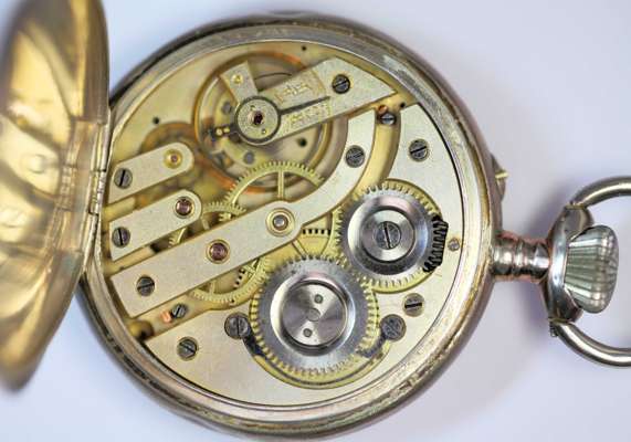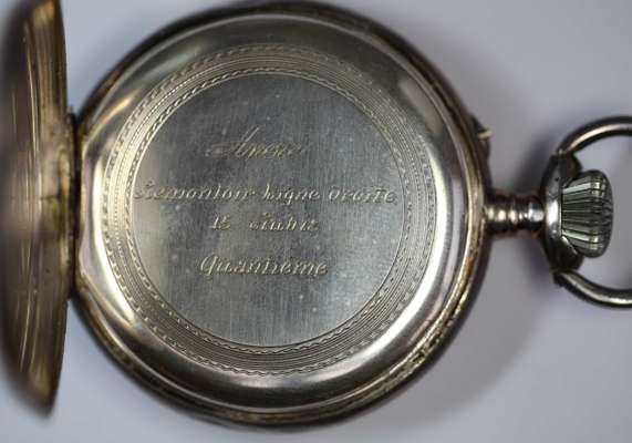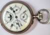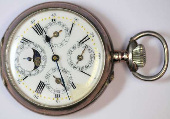 the 800 standard case with engraved and decorated hinged cover, white enamel dial with subsidiary seconds dial with moon phase, month, day, date dials, Roman numerals, keyless wind movement