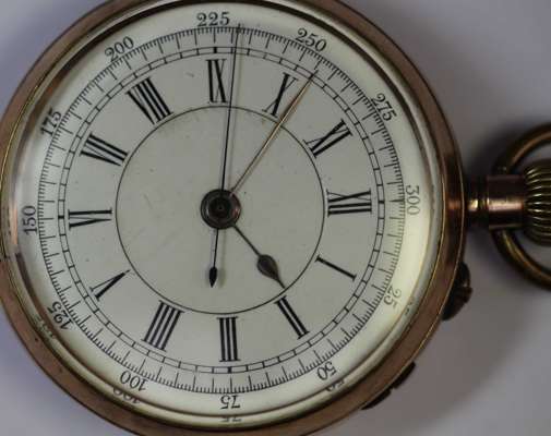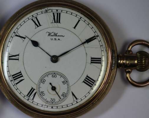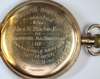 full hunter case, keyless wind, the dial inscribed Waltham U.S.A., Arabic numerals and subsidiary seconds dial, engraved presentation inscription to cuvette; together with a French gold cased pocket stop watch, keyless wind lever action