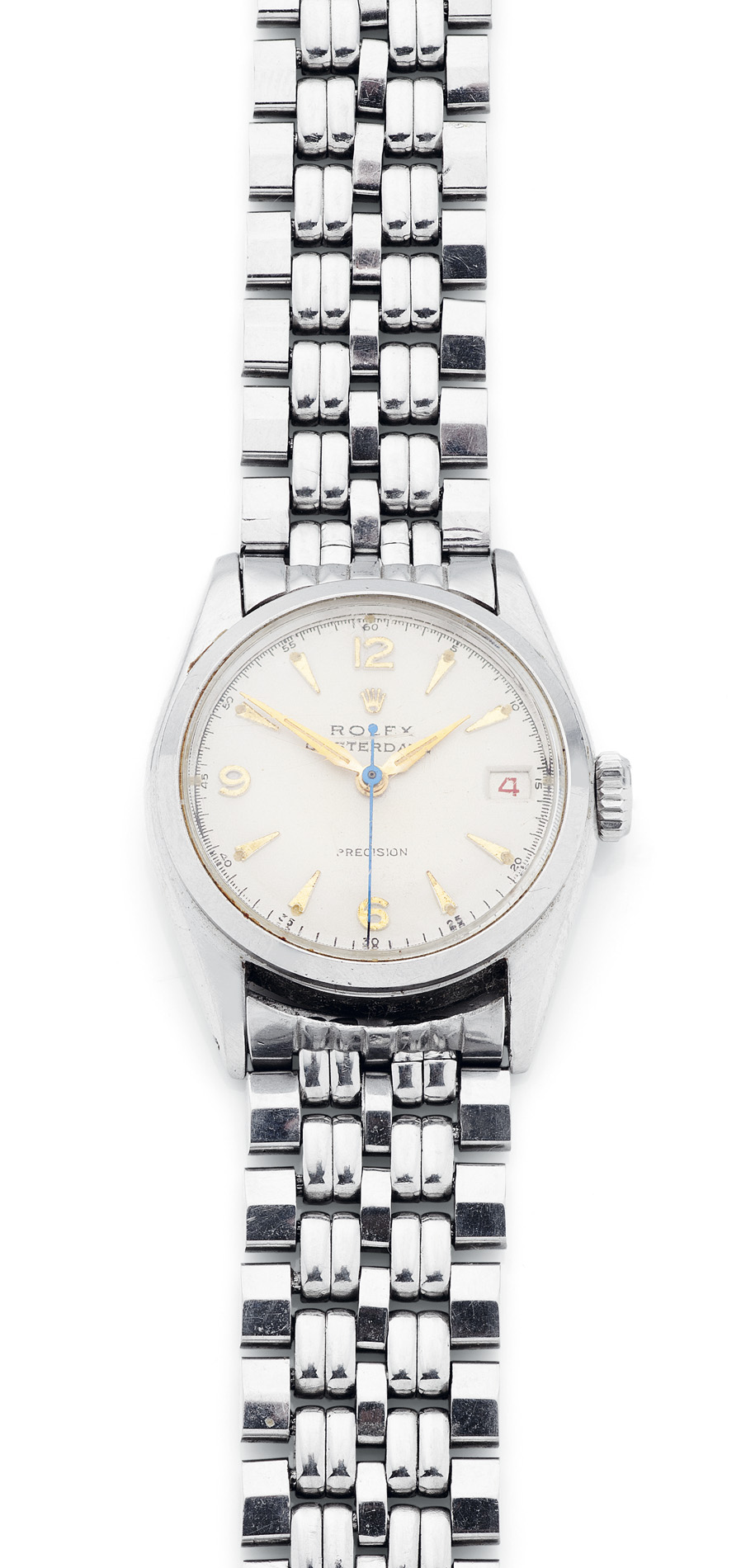 off white dial, baton and Arabic numerals, sweep second hand, date aperture, later stainless steel bracelet