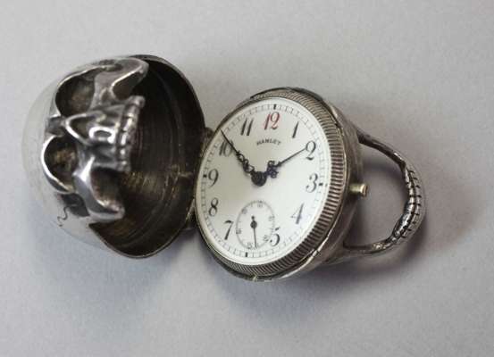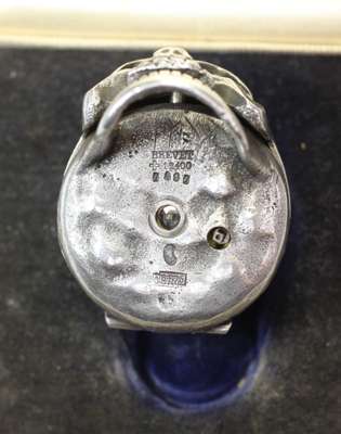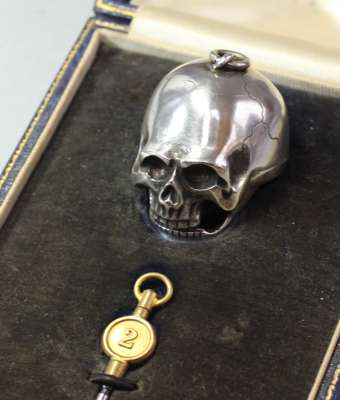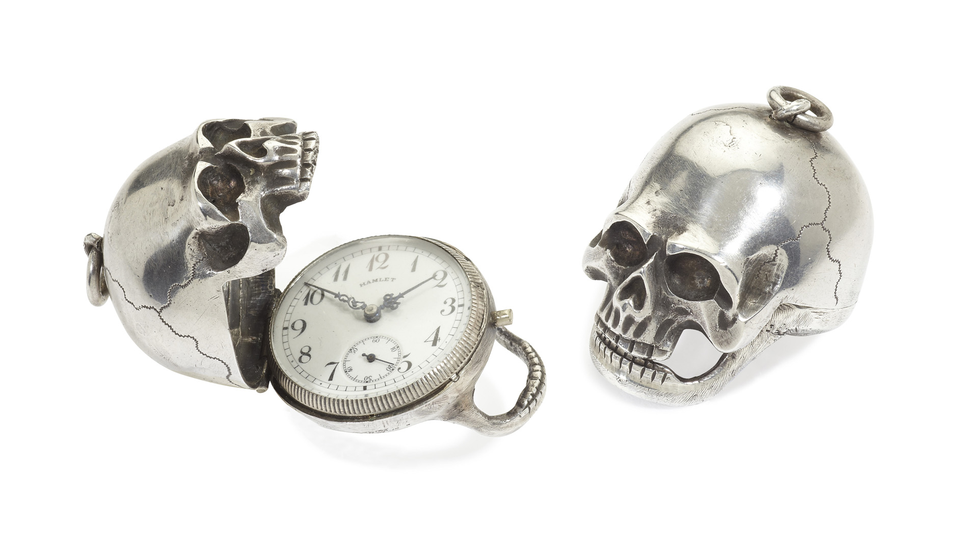 the well modelled skull hinged at the jaw bone, enclosing a simple timepiece, enamel dial inscribed Hamlet - (a connection to Shakespeare's Hamlet and Yorick), the case stamped with French control marks, Brevete and numbered 1240 and 7917, engraved to the rear of the skull "qua hora nescis" you never know the hour, cased in fitted box with a key