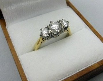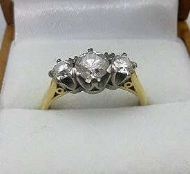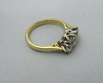 the circular brilliant cut diamonds claw set in 18ct white gold, the principal diamond approximately 0.65cts, pierced gallery, plain yellow 18ct gold shank