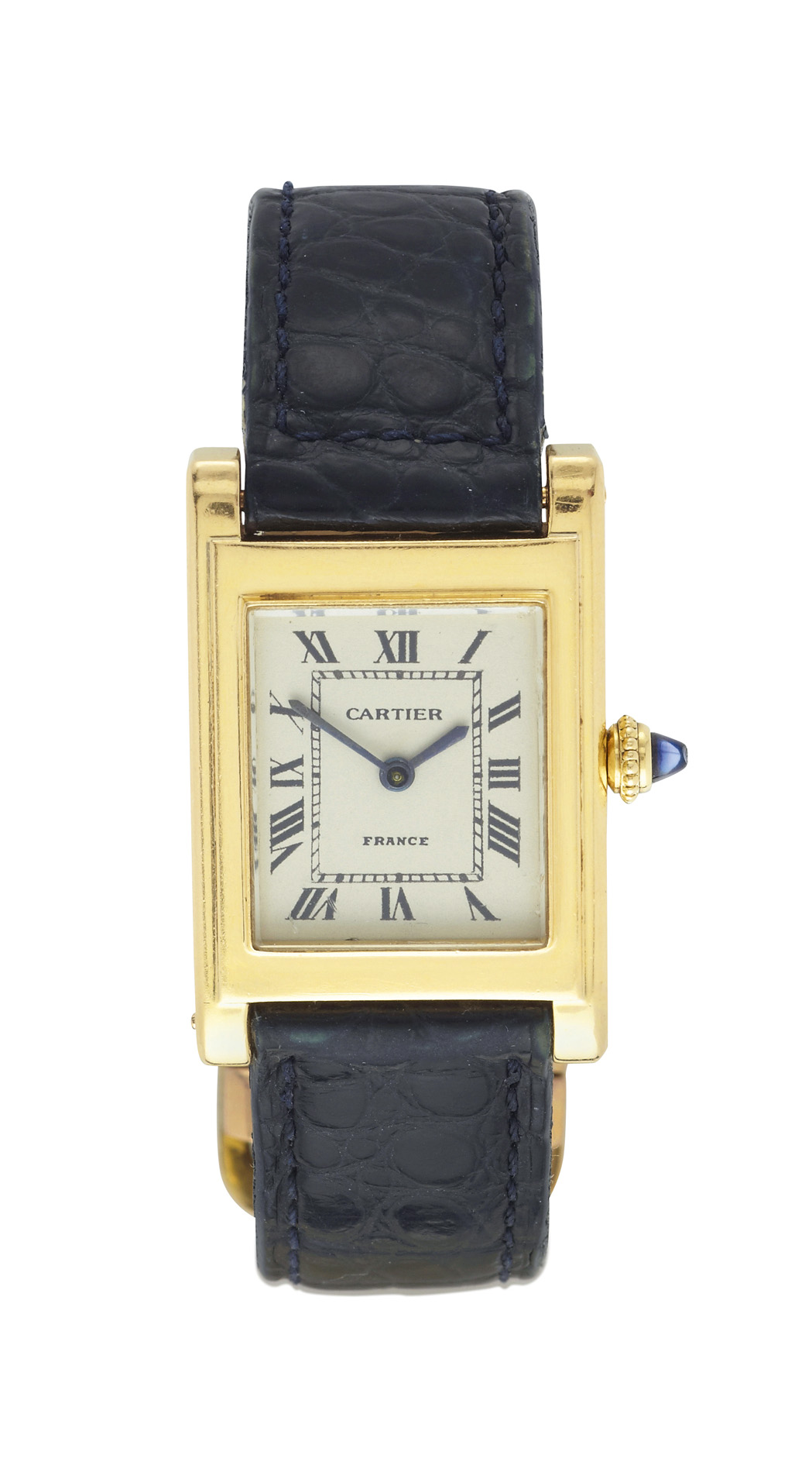 tank shaped, stepped bezel design, white dial, Roman numerals, screwed back, sapphire cabochon winder, leather strap with gold fold over clasp