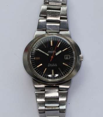 oval stainless steel case, circular black dial inscribed Omega Automatic, Geneve Dynamic, baton numerals, sweep second hand, date aperture, integral Omega stainless steel bracelet