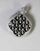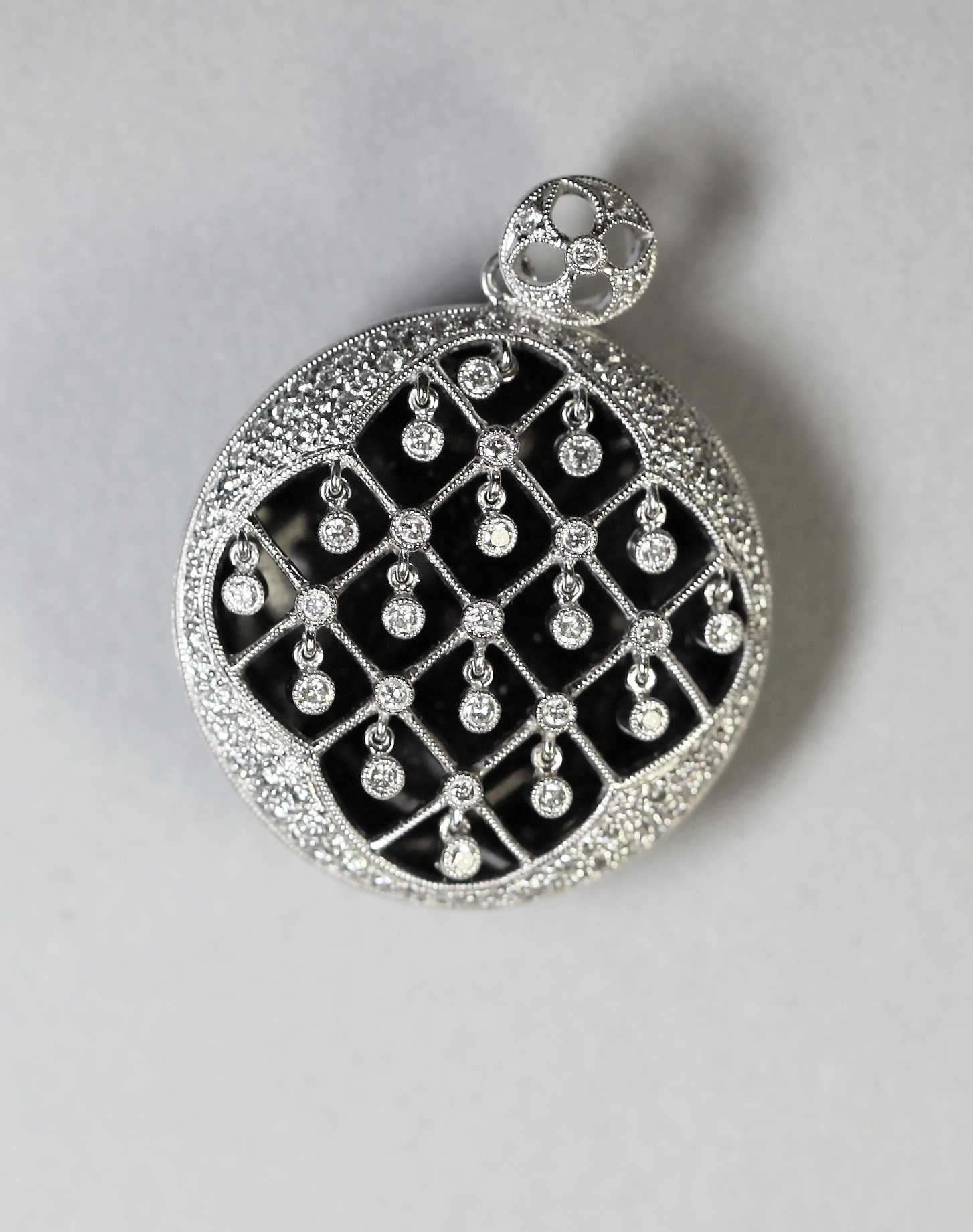 the circular pendant with diamond set bale, the domed disc with rear black convex disc, the front of trellis form, each intersection with a small diamond set drop, millegrain setting, the outer border pave st diamonds