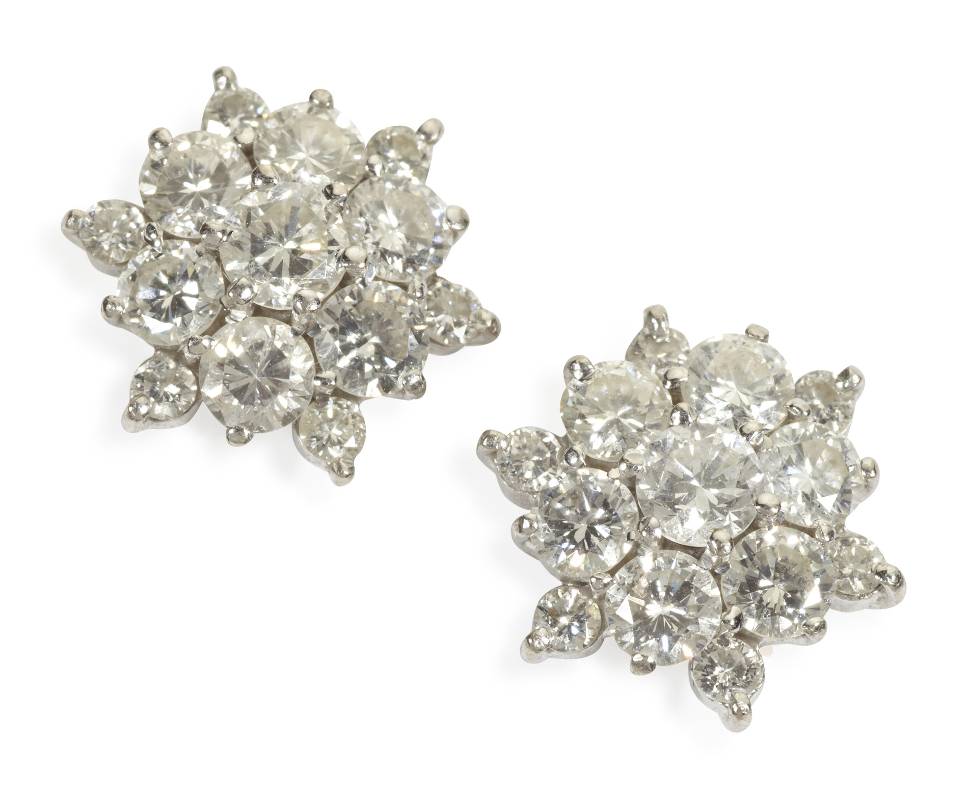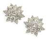of floral cluster design, each claw set with seven round brilliant cut diamonds, in an outer border of six smaller round cut diamonds, with post and screw fittings