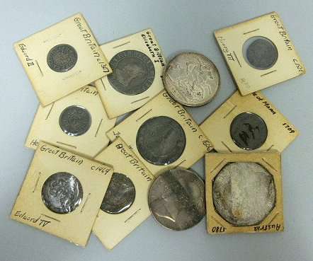 To include a groats of Henry VIII, Edward IV, shillings of James I and Elizabeth I, Halfgroat of Henry VII and Pennies of Henry III and Edward II; together with a small group of milled coinage to include a 1845 Victorian crown, 1887 Crown and an Maria Teresa Thaler (qty)