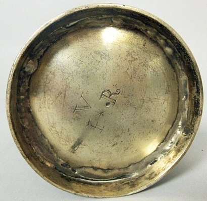 makers marks only IB struck twice, of flared can form with punched and fluted borders and decoration, raised on a stepped foot and with S scroll strap handle, with engraved initials to base