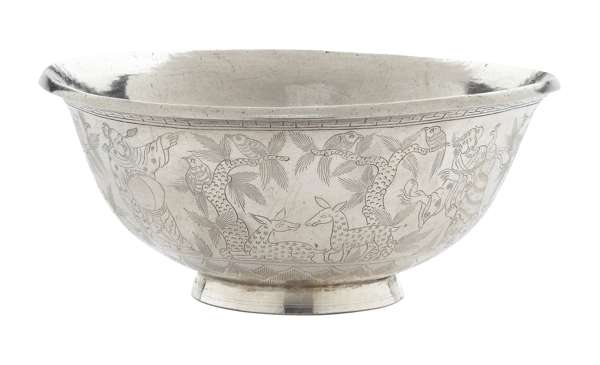 marked to base KAM BUDHARAJ EKHACHHE PATAN NEPAL, of simple tapered form with engraved animals and figures within landscapes