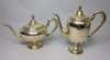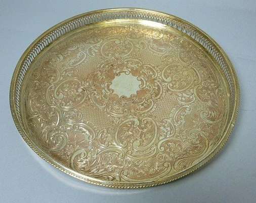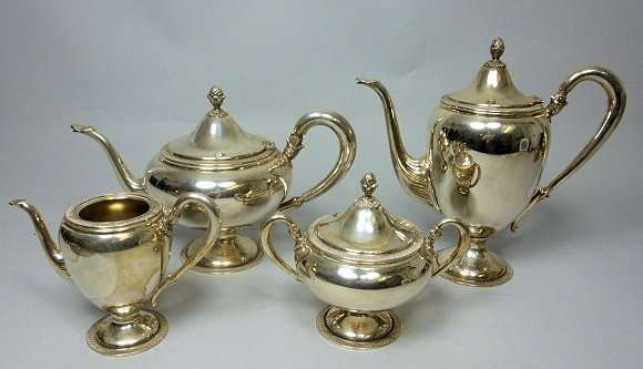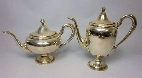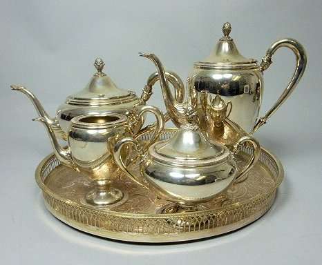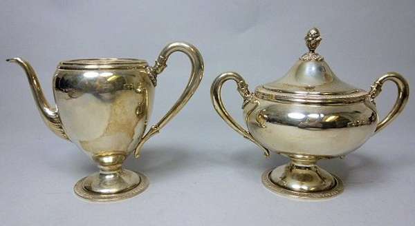 markers mark indistinct, stamp 800, comprising a tea pot, coffee pot, sugar bowl and milk jug (lid lacking), of plain form with stylized foliate detail to rim, the circular swept foot with similar detail; together with a circular silver plated tray with pierced rim and engraved foliate detail (5)