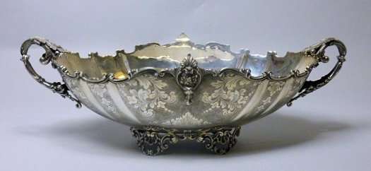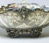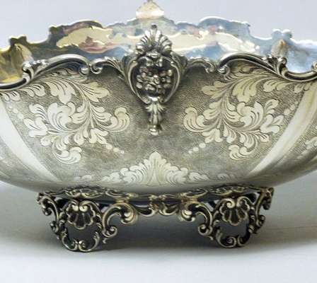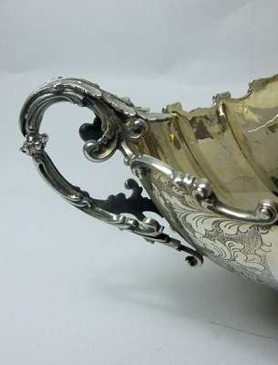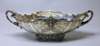 marked 925 STERLING, of oval outline, with scalloped foliate detail to rim, similar acanthus leaf twin handles, the body with engraved foliate detail, to four pierced scrolling bracket feet