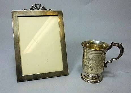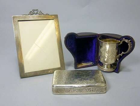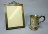 to include a photograph frame with applied bow detail; a small cup christening cup in a fitted case; a small table box of rectangular outline with engraved foliate detail (3)