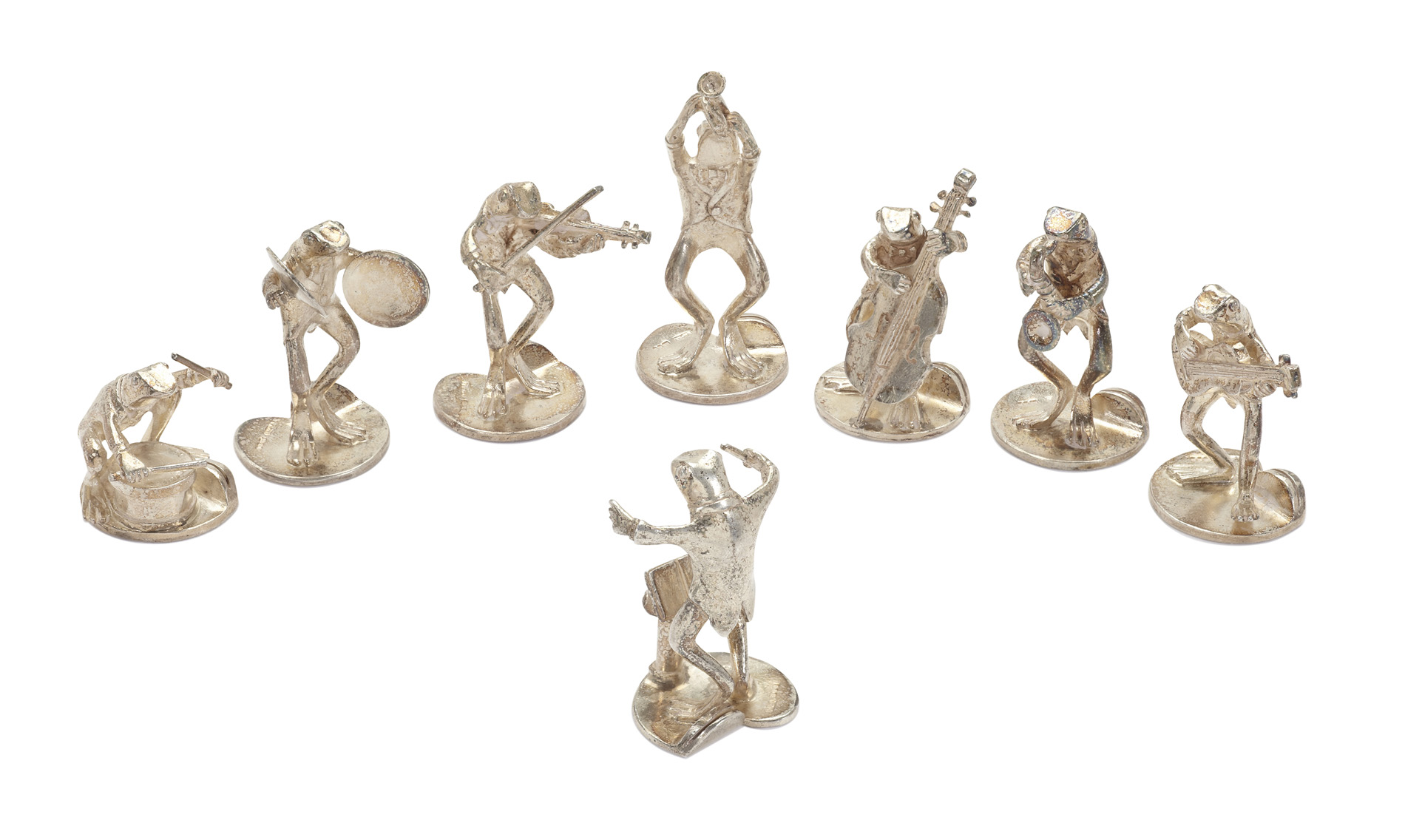 A set of eight silver novelty menu holders